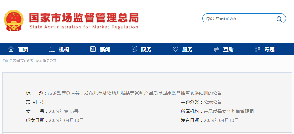 2023年4月10日,國家市場監管總局發布了兒童及嬰幼兒服裝等90種產品質量國家監督抽查實施細則的公告...